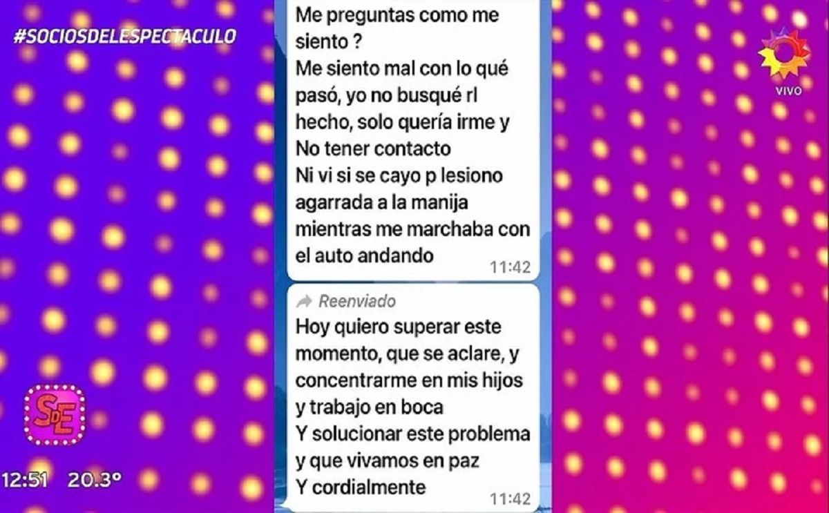 «Yo no busqué el hecho, solo quería irme y no tener contacto. Ni vi que se cayó o se lesionó agarrada de la manija», termina uno de los primeros mensajes que envió dando a entender que nunca quiso lastimar a la madre de sus hijos.