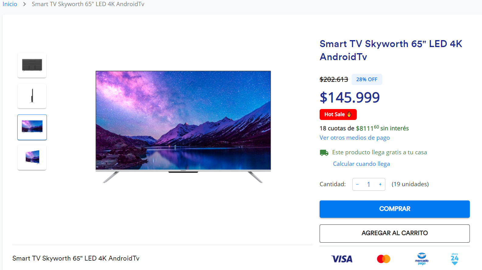 El Hot Sale en Argentina continúa y presenta una irresistible mega oferta en materia de tecnología. Se trata de un Smart TV con un descuento de $56.000 que, además, permite poder comprarlo en 18 cuotas sin interés y, por el precio, en envío es gratis.