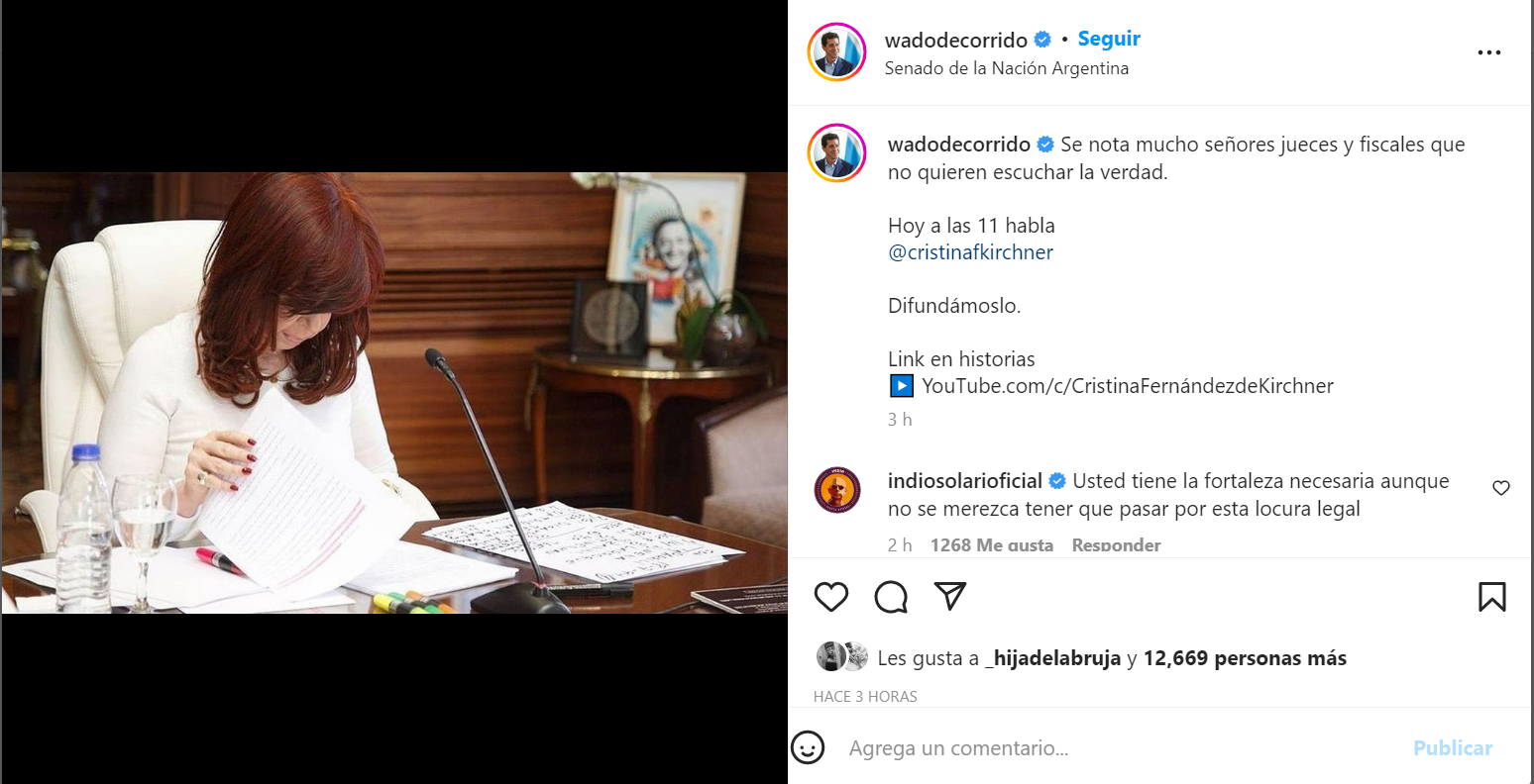 El Indio Solari, exlíder de la banda Patricio Rey y sus Redonditos de Ricota, no tardó en dejar por escrito el apoyo a la expresidenta, en el marco del descargo que brindó durante la mañana, en el cual aseguró que «esto no es un juicio a Cristina Kirchner es un juicio al peronismo y a los gobiernos populares».